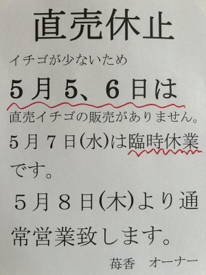 GWも後半が始まりました。 お天気も良く、お出かけ日和ですね。 苺香もたくさんの方にご予約をいただきました。 楽しんでいただけたら嬉しいです。 さて直売のお知らせですが、いちごが少… |