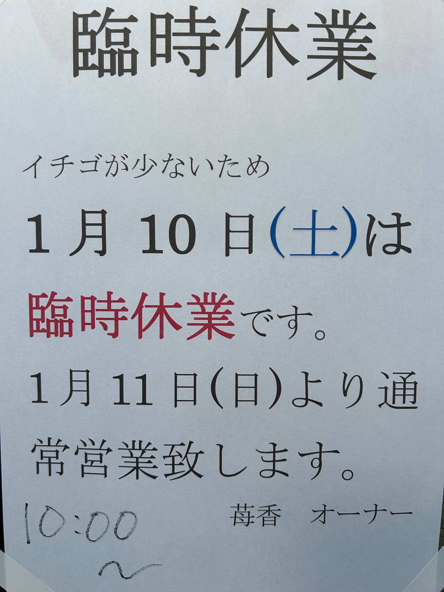 お祝いに苺を購入される方も多いと思いますが、苺はまだ多くなく1月10日(土)は臨時休業とさせていただきます。
