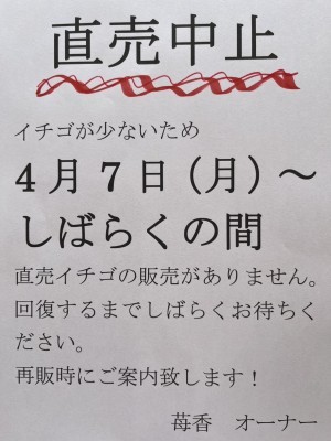 先日直売いちごの販売休止をお知らせしましたが、休みを挟み回復致しましたので販売を再開致します! 販売価格も見直ししますので、皆様のご来園をお待ちしております。 (^O^)/ … |